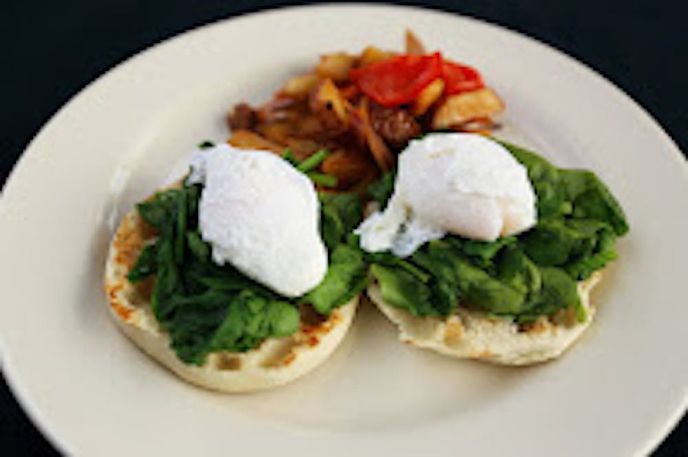 Two English muffins with spinach , two poached eggs and Hollandaise sauce, served with O'Brien potatoes and fruit garnish.