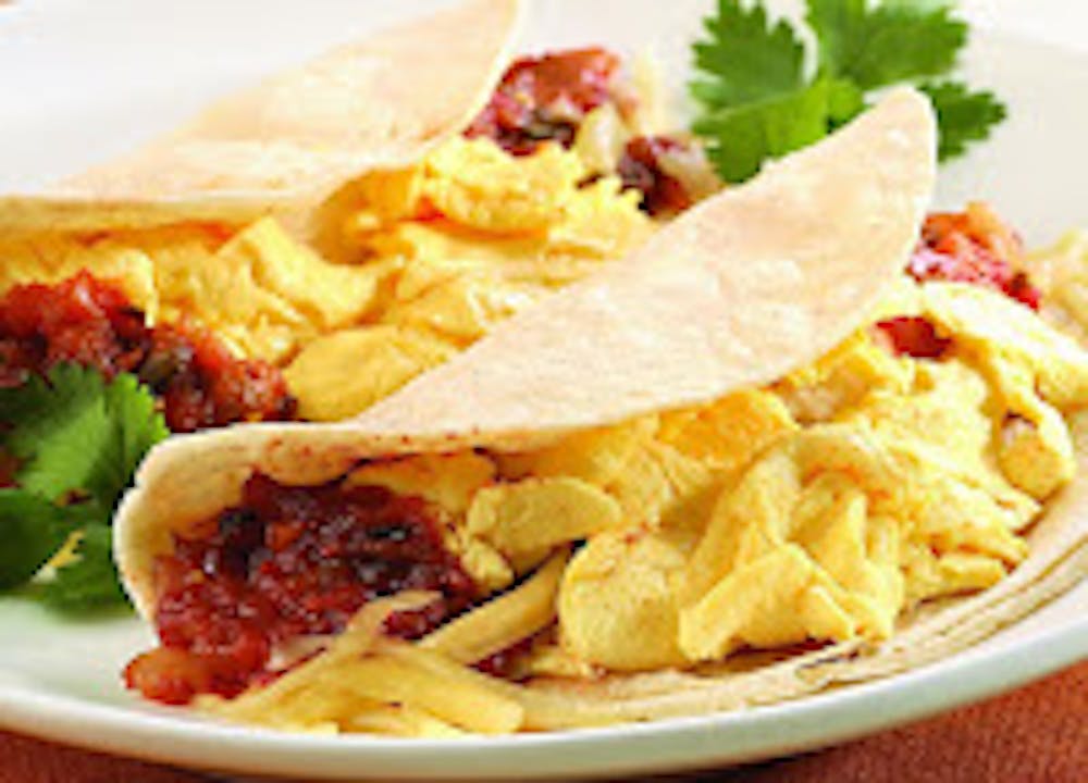Flour tortilla filled with two scrambled eggs and beans, covered with green sauce and melted cheese. Served with seasonal fruit.
